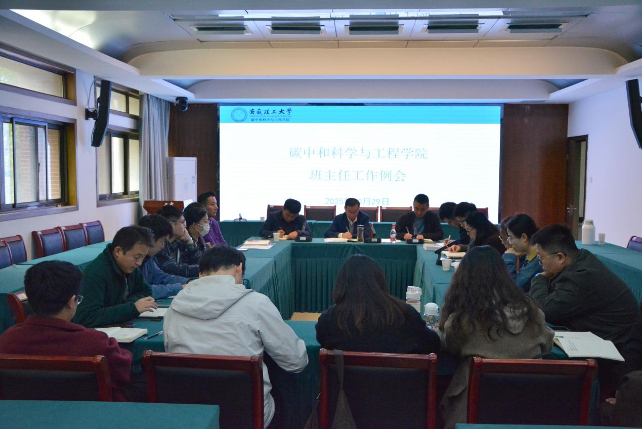10月29日,碳中和科学与工程学院在明德楼第二会议室召开班主任工作例会。院党委书记武成利、党委副书记王鹏、副院长古晓锋出席,会议由王鹏主持,全体学生班主任及辅导员参会。