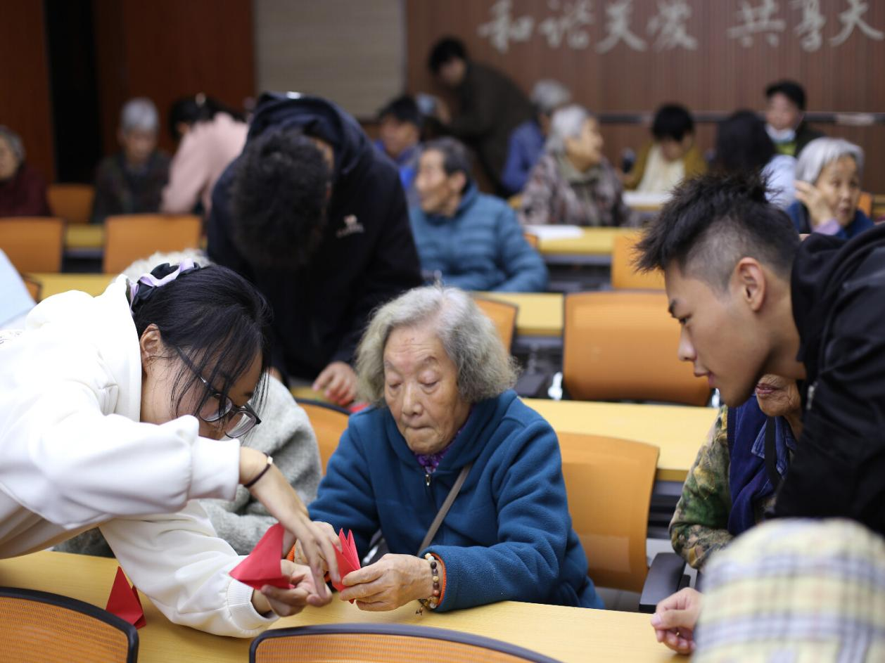 同学们走进九久夕阳红淮南市老年公寓,集体演唱歌曲《如愿》,悠扬歌声获老人阵阵掌声。分组互动环节,绘画组志愿者协助调色创作,书法组志愿者共书吉祥语,折纸组志愿者陪伴制作纸鹤等。同学们倾听老人讲述往事,不仅丰富了老人们的精神文化生活,同学们也受到了深刻的教育,更体现了青年学子弘扬敬老爱亲的传统美德。