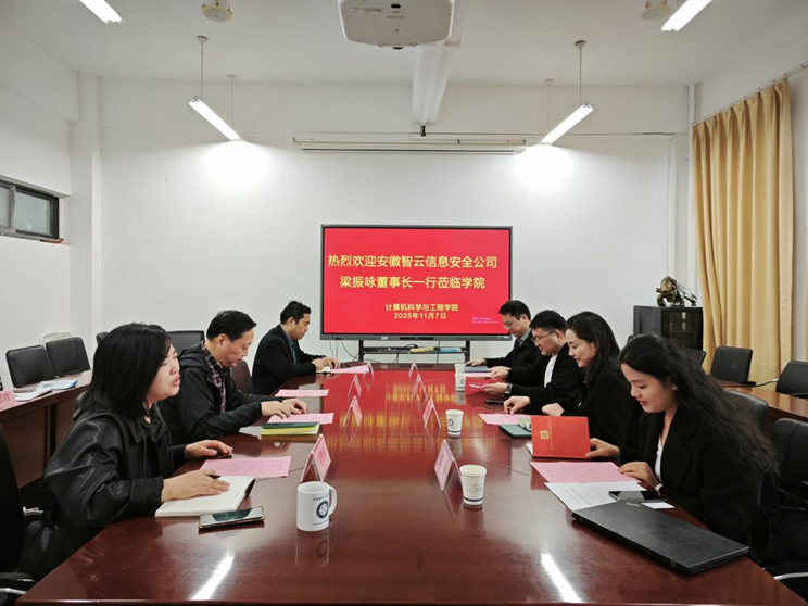 11月7日上午,安徽智云信息安全有限公司董事长梁振咏一行来计算机科学与工程学院走访交流,学院领导班子及毕业班辅导员参加座谈。