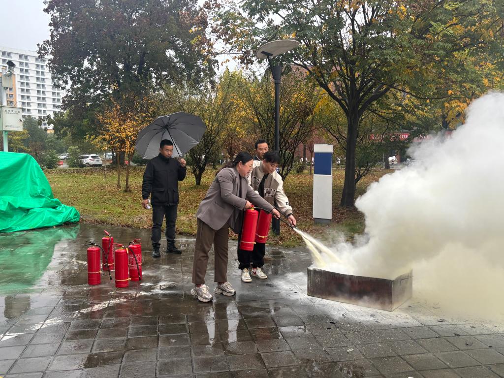 知识讲解结束后,消防实操演练随即展开。在专业人员现场指导下,师生代表依次拿起灭火器,面对模拟火点实操灭火流程,亲身感受火灾扑救的实际操作要点。