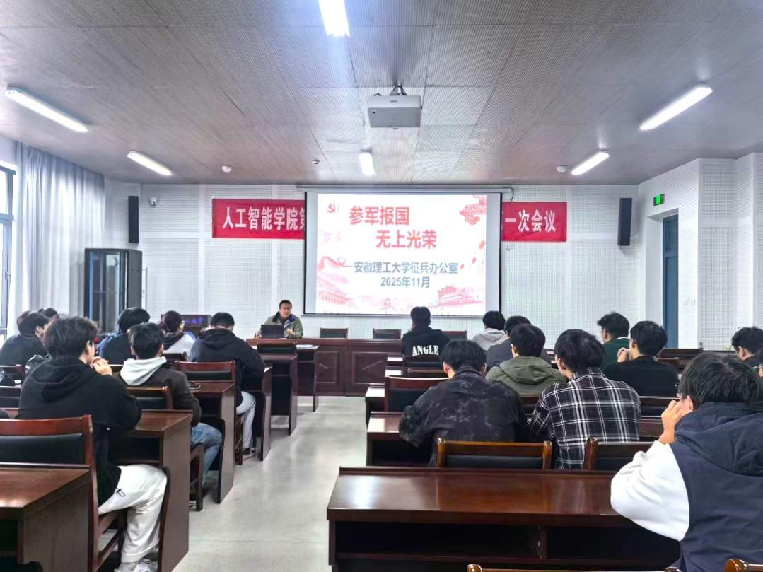 11月10日下午,人工智能学院邀请校党委武装部王广义老师为学生解读征兵政策。学院学生工作负责人、全体毕业班辅导员及60余名学生参会。