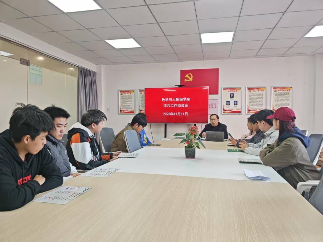 为鼓励青年响应国家号召,投身国防事业,11月11日,数学与大数据学院在义苑“一站式”学生社区举行2026届毕业生征兵推进会。毕业班辅导员及有意向参军入伍的学院毕业生参加动员会。校党委武装部徐意刚、退役复学学生代表郝艳应邀主讲。