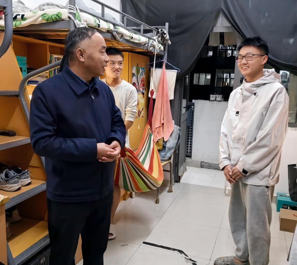 在平苑、义苑和信苑等宿舍区,张平松与不同年级本科生及留学生亲切交流,了解他们的学习状态和生活情况,倾听学生对宿舍和自习室管理的意见建议,鼓励同学们养成良好学习生活习惯,注意用电安全,保持宿舍整洁,并勉励他们珍惜大学时光,努力学习提升综合素质。走访中,张平松还重点检查了用电安全、消防设施配备、环境卫生等关键环节,同时与宿管人员深入交流,详细了解学生晚归登记、夜间巡查等管理措施落实情况。
