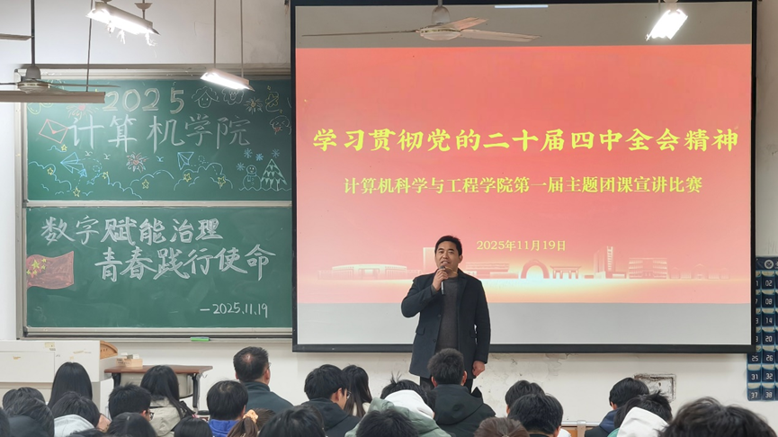 为引导广大青年学子深入学习贯彻党的二十届四中全会精神,11月19日晚,计算机科学与工程学院在天工106举办了第一届主题团课宣讲比赛。学院党委副书记葛斌为比赛致开场词。