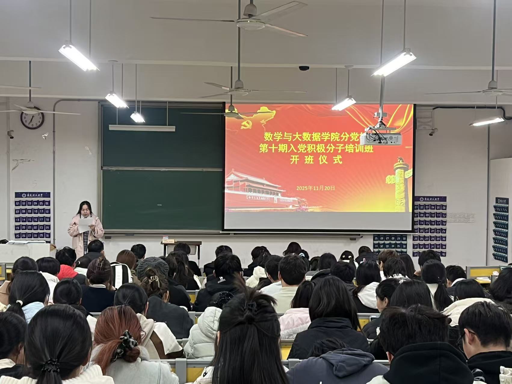 11月20日晚,数学与大数据学院分党校第十期入党积极分子培训班开班仪式在明理南214教室举行。院党委书记马蓓蕾、学生辅导员及本期全体入党积极分子参加仪式。