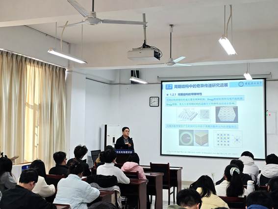 力学专业研究生导师崔建国的报告题目为“机械波在周期/准周期结构中的奇异传播特性”。他指出,声学/力学周期(准周期)排布的超材料,具有很多奇特的传递特性,如带隙的存在、非对称传递、拓扑效应等。对奇异传递特性的研究,可以为减振、降噪、完美吸收、能量采集等方向,提供多种设计方案与平台。