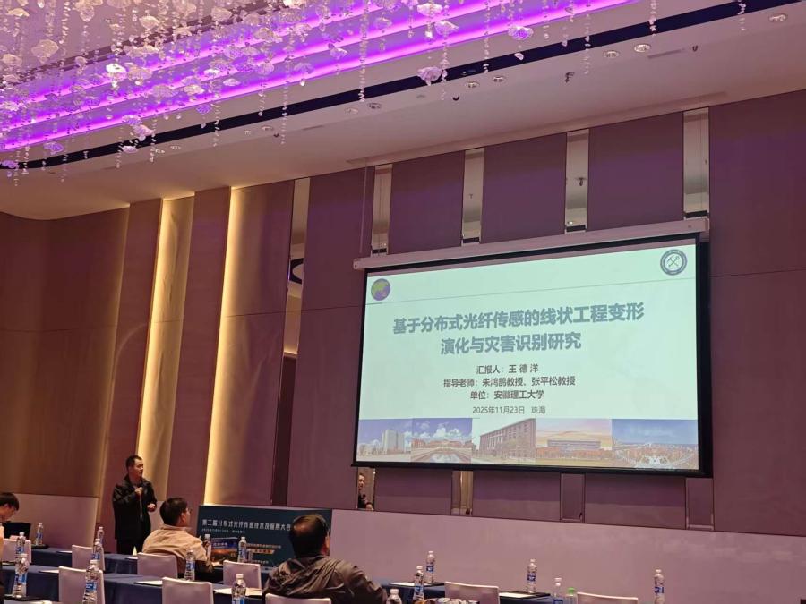 会议期间,地球与环境学院青年教师王德洋作了题为“基于分布式光纤传感的线状工程变形演化与灾害识别研究”的学术报告。硕士研究生史伟鹏、恽换勤和贾李岚也分别围绕“基于DAS的微震信号P波自动拾取方法研究”“不同耦合条件下分布式声学传感(DAS)被动源面波频散响应的实验研究”及“基于SVM-PCA的光纤监测数据深度学习补全方法研究”作了专题汇报。