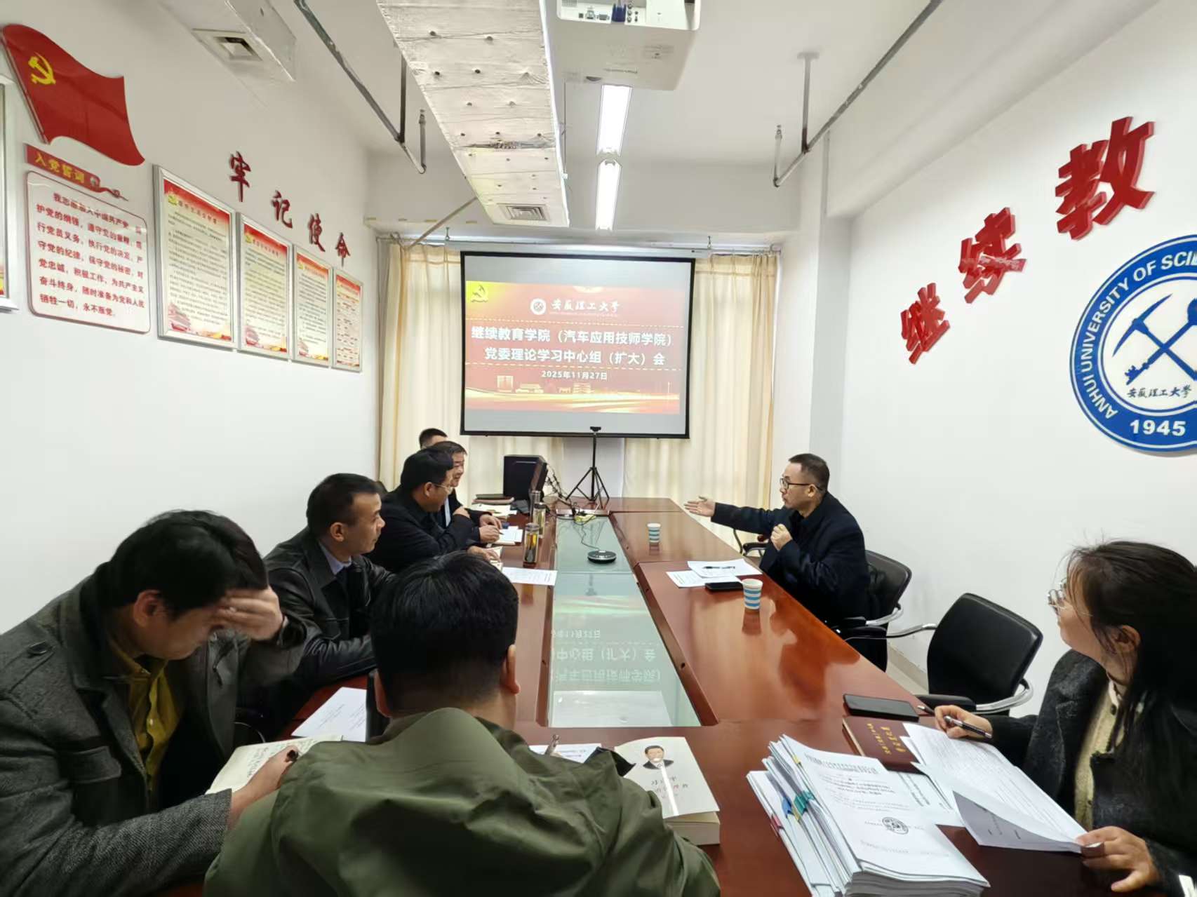 11月27日下午,继续教育学院(汽车应用技师学院)在舜耕楼402会议室,召开党委理论学习中心组学习(扩大)会议,集中学习研讨《习近平谈治国理政》第五卷。学习会由学院党委负责人主持,学校相关部门负责人列席旁听指导,新疆工程学院跟班学习干部、学院中心组成员和党支部书记列席。