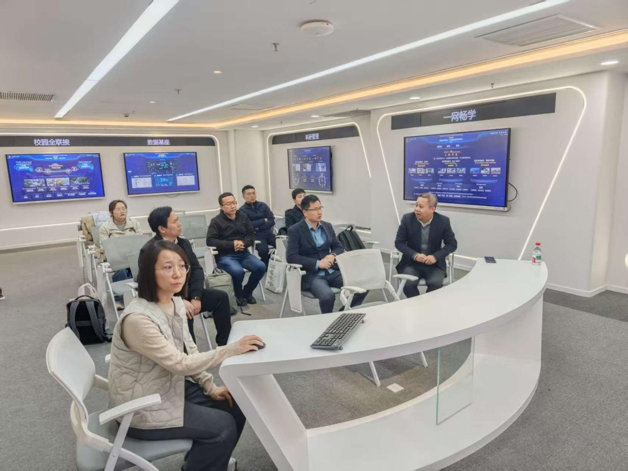 会上,上海理工大学李筠主任详细介绍了学校智慧校园建设模式及成果,重点介绍了智慧校园建设总体规划、“一网通办、一网畅学、一网统管”三张网思路、数据治理过程及应用,通过数字孪生校园实时展示学校实际运行状态,包括校园态势、教学态势、科研态势、智慧学习、智慧生活、智慧安防及历史风貌区线上游览等。上海大学宋阳老师首先介绍了信息化统筹建设的体制保障和具体模式,接着通过“绩效考核系统”详细分享了上海大学的数据治理思路及应用成效,展示了自主开发的物联网门禁等系统。调研团队结合自身实际工作,聚焦信息化统筹建设机制及体制保障、数据治理难点、网络安全、数智化基础设施建设及AI应用等方面内容与上海理工大学、上海大学与会人员展开了深入交流,会后参观了上海理工大学超算中心机房。