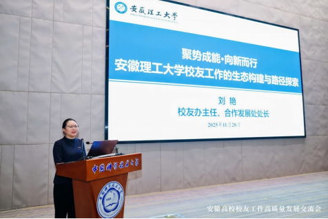 学校合作发展处处长、校友办主任刘艳以《聚势成能向新而行——安徽理工大学校友工作的生态构建与路径探索》为题作主旨报告。她从校情概况、工作实践、未来思考三个方面,系统阐述我校校友工作体系构建思路。她从织密校友网络、强化数智赋能、聚力捐资助学、深化校企协同、联动人才引育、赓续安理精神凝聚同心力等方面系统介绍了我校校友工作实践成效。她强调,校友工作需以情感为纽带,坚持双向赋能,推动校友资源与学校高质量发展同频共振,形成母校助力校友企业高质量发展,校友助力母校“双一流”创建的良性发展格局。
