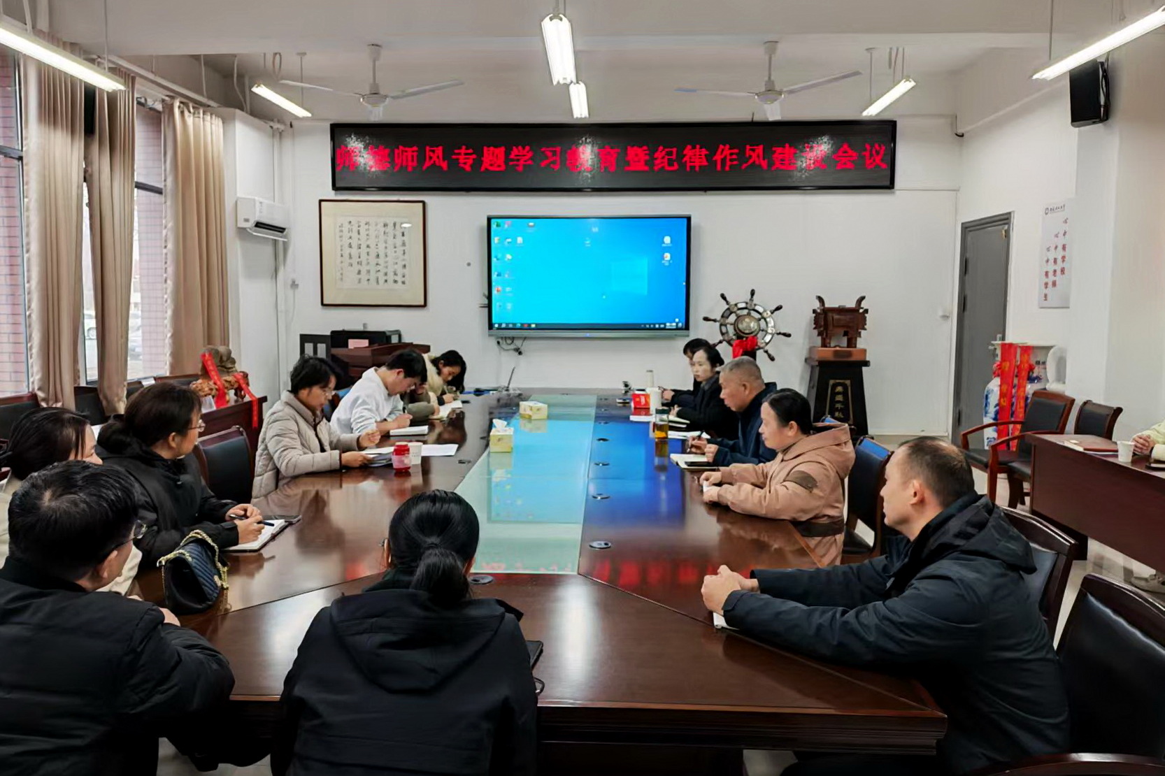 会议集体学习了教育部《关于建立健全高校师德建设长效机制的意见》《新时代高校教师职业行为十项准则》,重点解读了文件中“红七条”和“十项准则”的核心要求。通报了学校近期师德失范典型案例,通过身边事教育身边人,做到以案明纪、以案示警,引导教师知敬畏、存戒惧、守底线。