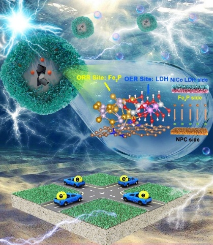针对可充锌空电池对ORR/OER双功能催化剂的高匹配需求,团队构建了以多重桥联界面为核心的电子流定向调控体系(图2)。该策略依托界面电荷转移实现位点电子态精细调控,建立了协同氧电催化的新范式,并在可充锌空气电池中获得高功率输出与稳定循环性能。相关成果以“Interfacial Electron Flow in a Fe2P@NPC(core)/NiCo LDH(shell) Heterostructure Enables Site-Specific Electronic-State Modulation for Bifunctional Oxygen Electrocatalysis”为题发表于《Applied Catalysis B: Environment and Energy》。