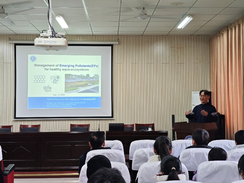 座谈会后,Lee-Hyung Kim教授做了《Management of emerging pollutants for healthy aqua-ecosystems》的学术报告。报告围绕工业发展和城市化进程中新污染物的产生与分布,气候变化背景下新污染物的迁移富集与生态危害,以及基于自然的解决方案在新污染物管理中的应用实践等,介绍了韩国在新污染物研究领域的最新进展。