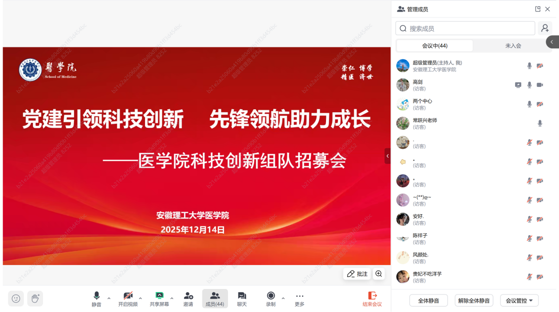 为践行党建引领、教研相长工作思路,助力2025级大一新生尽早接触学科前沿、明确发展方向,12月14日下午,医学院以“科技创新育人”为核心,通过线上视频形式,精心组织了一场2025级新生科技创新组队招募会。医学院双带头人高剑、副教授常跃兴、第十一届挑战杯省赛金奖指导老师闫忠忠三位党员教师担任主讲嘉宾,为新生带来一场兼具专业性与实用性的科研启蒙盛宴。药学系老师、新生辅导员、2025级临床医学专业和药学专业学生参与了此次活动。