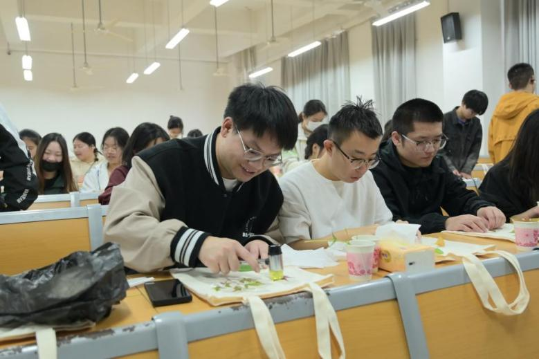 11月2日,学院在天工102教室举办“拾光植愈,扫尘拓心”心理主题活动,同学们依个人喜好挑选拓印载体与植物素材,在工作人员指导下,有条不紊地涂抹颜料、固定叶片、轻敲拓印。随着锤击力度的轻重调控,草木的独特纹理与鲜活色彩渐渐在载体上晕染绽放,原本朴素的帆布包、宣纸瞬间变得灵动鲜活,承载着每个人独有的创作巧思。