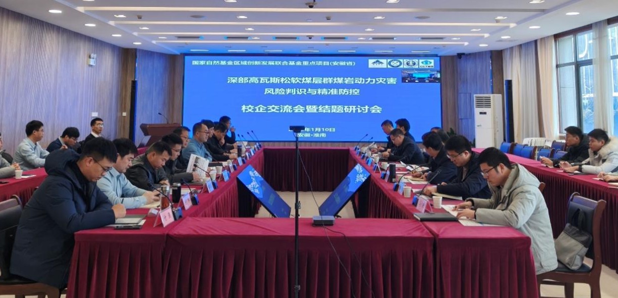 1月10日,由安徽理工大学牵头,联合中国矿业大学和中煤科工集团重庆研究院承担的国家自然科学基金区域创新发展联合基金重点项目“深部高瓦斯松软煤层群煤岩动力灾害风险判识与精准防控”校企交流会暨结题研讨会在学校召开,能源安全与清洁利用学部常务副主任华心祝、校科研部副部长鲁海峰出席。校企交流会由项目负责人杨科教授主持,中国矿业大学、中煤科工集团重庆研究院相关课题负责人、淮北矿业股份有限公司原技术中心主任陈贵、地测与通防部部长丁卫平,淮南矿业(集团)有限责任公司潘三矿矿长董瑞刚、朱集东矿总工程师丁永、丁集矿总工程师罗孝勇、宿州煤电(集团)有限公司界沟矿总工程师马跃、深部煤炭安全开采与环境保护全国重点实验室副主任任波和参研单位骨干30余人参加会议。