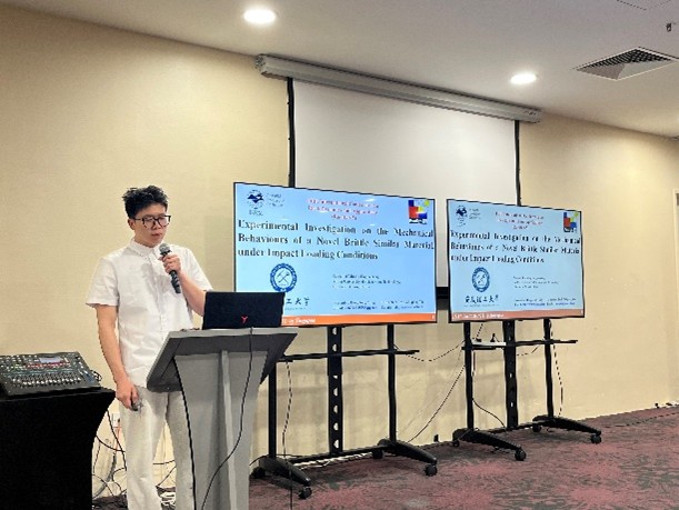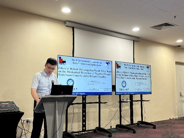 会议期间,杨冬冬、郑诗奇在Rock Fracturing Technology专题论坛中分别作了Experimental Investigation on the Mechanical Behavior of a Novel Brittle Similar Material under Impact Loading Conditions与Effect of Hybrid Polypropylene and Basalt Fiber Ratio on the Mechanical Propertics of Negative Poisson's Ratio Foam Concrete under Dynamic Loading的学术汇报,得到国内外相关专家学者认可。