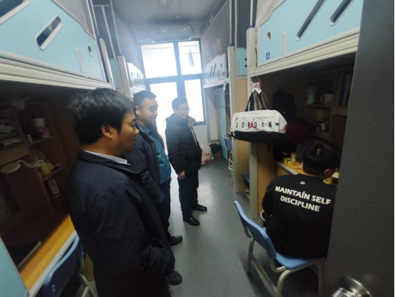 寒假将至,为筑牢校园安全防线,保障学生生命财产安全,传递学院关怀,1月21日,碳中和科学与工程学院党委书记武成利带队深入学生宿舍,开展寒假前安全专项检查,院党委副书记王鹏、副院长古晓锋和辅导员陪同走访。