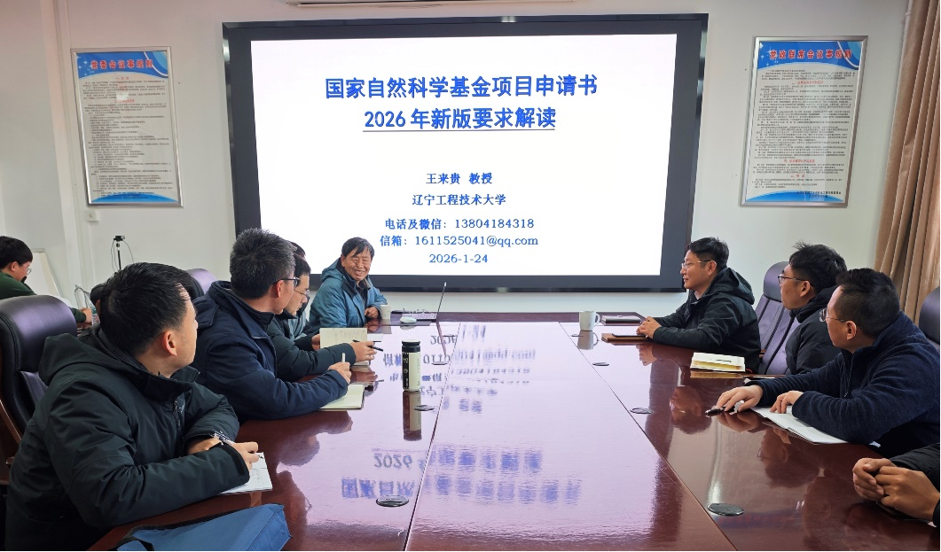 为了进一步提升国家自然科学基金申报工作,1月24日下午,矿业工程学院在宁远楼A406会议室举办2026年度国家自然科学基金申报第三次专题辅导报告会。国家自然科学基金委员会专家评审组成员、辽宁工程技术大学王来贵教授应邀作题为《国家自然科学基金项目申请书2026年新版要求解读》的专题辅导报告。学院2026年度国家自然科学基金申报教师30余人参加会议。会议由学院院长马述起教授主持。