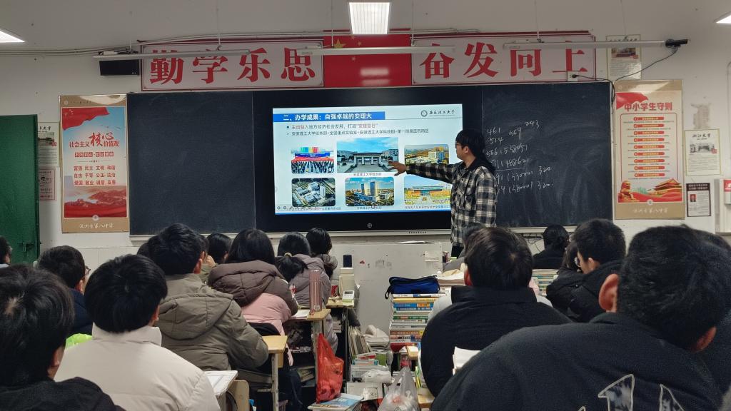 宣讲中,严诚慧和朱睿详细阐述了学校在办学特色、学科优势、科研创新、人才培养等方面的突出成果。两位同学还结合自身在专业学习、科技竞赛、校园文化等多元经历,与现场学生进行了轻松而深入的交流,诚挚邀请他们积极报考安徽理工大学,加入这片充满活力与机遇的学术沃土,共同探索知识、实现理想。