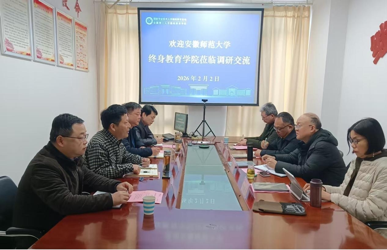 2月2日,安徽师范大学终身教育学院副院长方群、张韬一行4人来校调研继续教育工作。继续教育学院党委书记王开松,院党委副书记、院长平琦,相关科室负责人参加调研交流会。