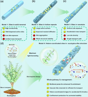 氧还原反应涉及氧的吸附、传输与在活性位点上的催化过程,需要对整个反应路径进行协同优化。然而,传统研究往往只关注其中某一个环节,难以实现对O2的“全路径管理”。据此,研究团队受桉树叶多级脉络结构启发,在氮掺杂碳骨架上原位生长钴掺杂Fe2P纳米颗粒,构筑出兼具多级孔道和异质配位结构的层级纳米架构。通过Fe-N锚定形成的Fe-P-Co异质配位桥,显著增强了界面电子耦合与极化效应:一方面,层级结构在电极表面产生局域电场,有效富集OH-和O2;另一方面,多级孔道大幅提升了氧传输效率,从而协同优化了氧的吸附、迁移与活性位点电子结构。电化学测试表明,该催化剂在碱性介质中的半波电位达到0.938 V,兼具高活性与长寿命。该研究通过将仿生结构设计、异质配位桥构筑与电子态调控有机结合,实现了对氧还原反应的“全路径氧管理”,为高效氧电催化体系的设计提供了新的思路。
