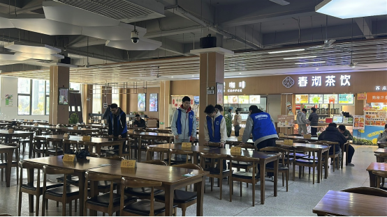 活动中,毕业生党员们身穿蓝色志愿马甲,分组行动。一组志愿者在食堂内部整理桌椅,将用餐后的椅子归位、桌面擦拭干净,为师生营造整洁舒适的用餐环境;另一组在食堂周边规整摆放车辆,把乱停乱放的电动车、自行车逐一排列整齐,疏通通道,方便行人通行。