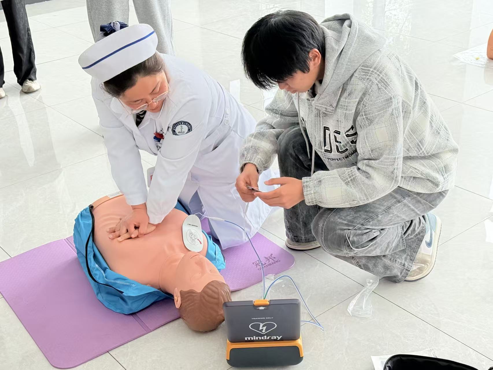 在实践操作演练环节,专家现场演示了AED设备的开机、电极片粘贴、规范放电的全流程操作,以及心肺复苏胸外按压的位置、频率、深度和人工呼吸的规范动作,随后组织学生分组开展模拟急救场景演练,一对一纠正学生不规范的操作动作。