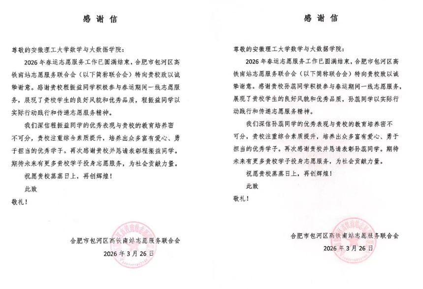 近日,合肥市包河区高铁南站志愿服务联合会向数学与大数据学院发来感谢信,高度赞扬数据科学与大数据技术专业25-4班程振益、孙蕊两位同学在2026年春运志愿服务中坚守一线、无私奉献的突出表现,并对学校的育人成效给予充分肯定。