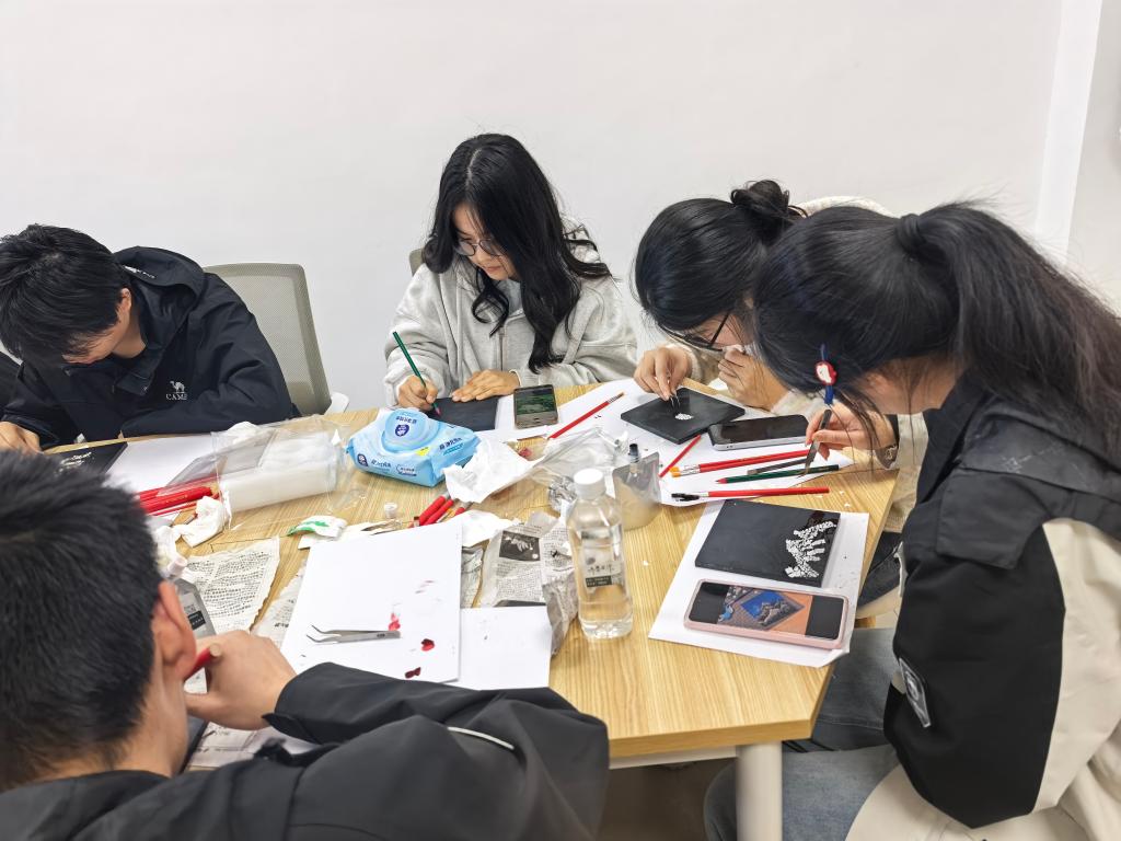 创作过程中,同学们迅速沉浸其中,现场氛围安静而专注。大家手持画笔蘸取漆料,从生疏试探到熟练创作,将内心情绪与生活感悟融入作品,或在流畅线条中平复浮躁,或在色彩搭配中释放负面情绪,或在大胆创新中融合青春朝气与非遗厚重。此次活动让学子近距离感受传统工艺的独特魅力,在沉浸式创作中收获成就感,学会在专注中调节情绪、在坚持中舒缓压力,实现“以艺润心、以美怡情”的心理疏导目标。