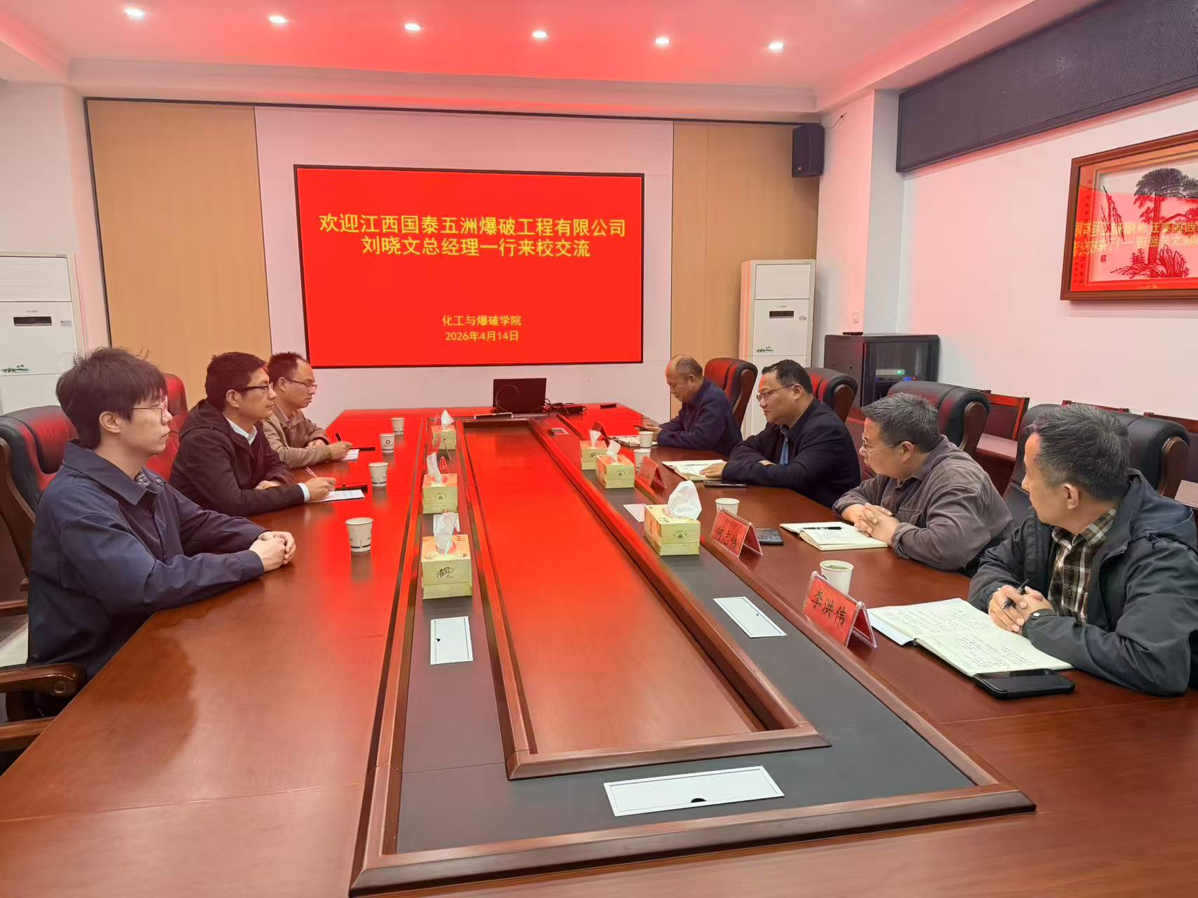 4月15日下午,江西国泰五洲爆破工程有限公司总经理刘晓文、技术部部长肖国喜一行4人到化工与爆破学院开展调研交流活动。交流会由学院党委副书记、院长汪泉主持,爆炸科学与工程系专业教师代表参加交流会。