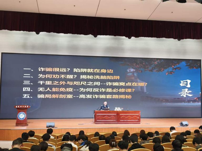 针对当前校园电信网络诈骗高发频发态势,高新区公安分局法制大队王远警官带来专业反电诈专题宣讲。王远结合多年一线办案经验,聚焦大学生群体易遭遇的刷单返利、虚假购物、冒充客服退款、校园贷、游戏账号交易、冒充公检法等典型诈骗案例,用真实、鲜活的案件还原诈骗分子作案手法,深入剖析诈骗套路与陷阱,细致讲解受骗后的应急处置方法。