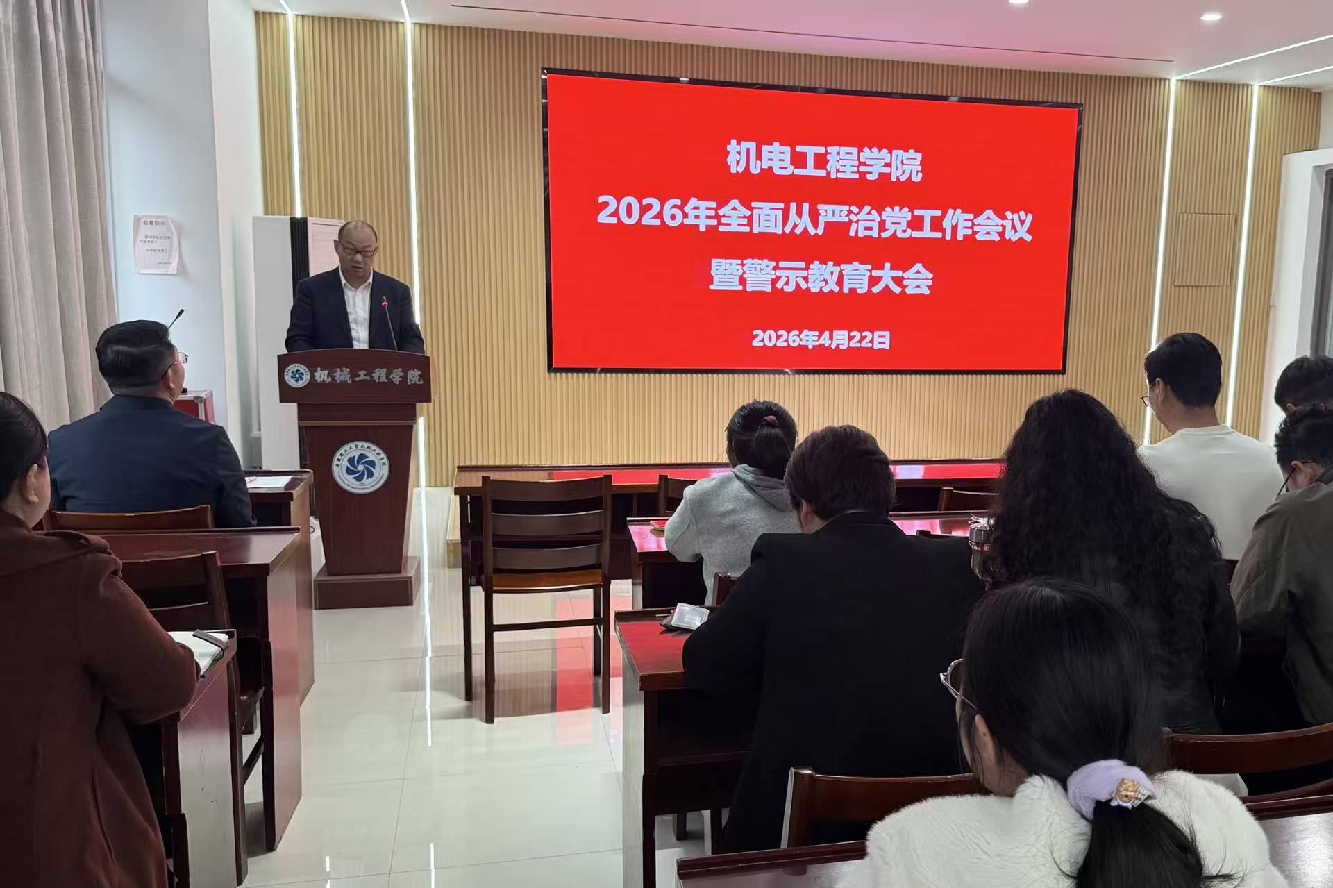 4月22日下午,机电工程学院在励学楼B403报告厅召开2026年全面从严治党工作会议暨警示教育大会,深入学习贯彻习近平总书记关于党的自我革命的重要思想,集中学习二十届中央纪委五次全会、省纪委十一届六次全会、2026年全省教育系统全面从严治党工作视频会精神,传达学习学校2026年全面从严治党工作会议上的部署要求,通报典型案例,开展警示教育,部署学院下一步重点工作。学院领导班子成员、党委委员、纪委委员、全体党支部书记、科级干部参加会议。