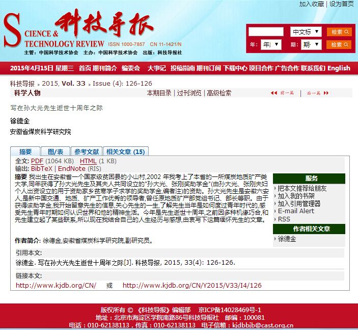 他是一名来自国家级贫困县——安徽舒城的学子,在校期间连续4年获得孙大光、张刚助学金,连续三年获校优秀学生奖学金和“三好学生”荣誉称号。今年适逢孙大光先生逝世十周年,怀着一颗感恩和缅怀之心,他撰文《写在孙大光先生逝世十周年之际》发表在中国科协会刊《科技导报》(2015年04期)上,以此纪念不仅给予他经济资助、更给予他精神上激励和鞭策的孙大光先生。文章回顾了孙大光同志的青年时代以及担任地质矿产部部长后对我国地质工作的巨大贡献,特别提到自己受先生潜移默化的影响,立志学习地质,从事能源(煤矿)地质灾害防治方面的科研工作。在文中,他这样写到:“我虽没有先生那样渊博的知识和横溢的才华,那样高尚的品格和思想境界,也谈不上为国家作多大贡献,但我会以先生为榜样,做一个对社会有贡献的人,做一个合格的地质工作者”。“每一位受先生资助的同学都会深切地感受着先生的浓浓乡情和亲情,感受着先生的高尚人格,同时也鞭策自己在人生道路上向先生学习”。
