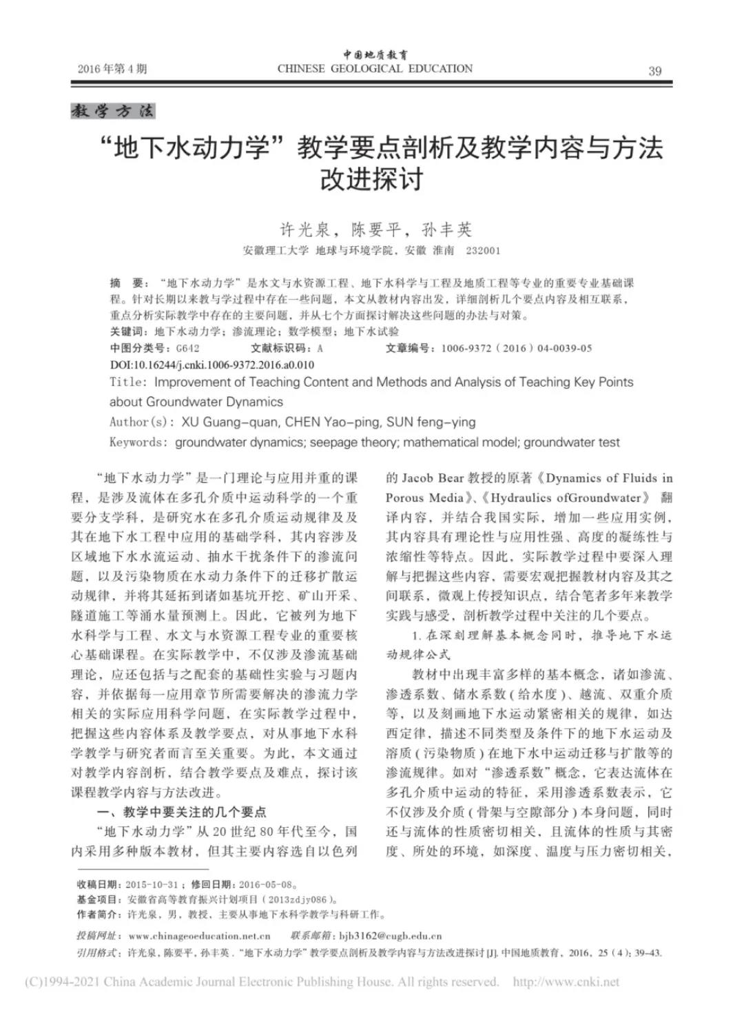 许光泉不仅深耕生产科研,还潜心从事教学研究,与其他老师一道,多次修编水文与水资源工程、地下水科学与工程专业培养方案,先后主持了“地下水科学与工程”专业教学改革与人才培养新模式研究、自动化地下水参数测试仪、水文与水资源工程专业教学改革与人才培养模式研究”等教学研究项目,近年来发表了《基于赛事培养大学生创新能力的实践与思考》、《“地下水动力学”教学要点剖析及教学内容与方法改进探讨》、《提高水利工程认识认识实习教学质量的探讨》等教学论文。地下水17-1班的韩志成同学说:“许老师上课比较注重理论与实践结合,有的时候会利用上课时间带我们去户外学习,让我们认识到课本上描述的现象。”无论是科研项目,还是教学项目,多年的教学实践使得许光泉认识到 ,只有参加一些切实的实践项目,才会锻炼一个人教学与科研能力。唯有通过参与生产实践活动,才能把“产、学、研”融为一体,才能使培养的学生更好地为行业服务。
