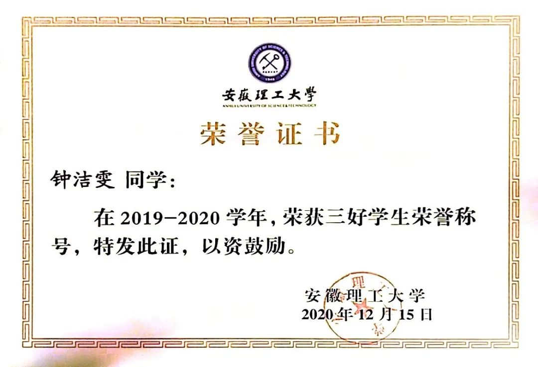 不同于其他迷茫的大一新生,钟洁雯对自己的大学生活有着清晰的定位和规划,大一加入学生组织,大二参加学科竞赛,大三准备深造。因为有目标的驱使,整个大学期间,她都一如既往地保持着高中时期认真的学习态度。得益于高中养成的优秀学习习惯,钟洁雯有一套自己的学习方法,她会在课前抽时间将学习的内容进行预习,“这样就能跟上老师思维,也能把知识点记得更加牢固。”她说。上课做好笔记,课后再将笔记按自己习惯的方式整理一遍,让知识点内化成自己的东西。或许这些方法大家都耳熟能详,但她踏踏实实坚持了四年,没有丝毫懈怠,正是这种坚持让她打下了扎实的专业基础。第四届“深水杯”全国大学生给排水科技创新大赛创意组一等奖;第十三届“认证杯”数学中国数学建模网络挑战赛全国比赛一阶段优秀奖、二阶段三等奖,这是钟洁雯大学四年的学科竞赛斩获,一张张获奖证书是她努力的有力见证。大学期间,她的成绩一直名列前茅。