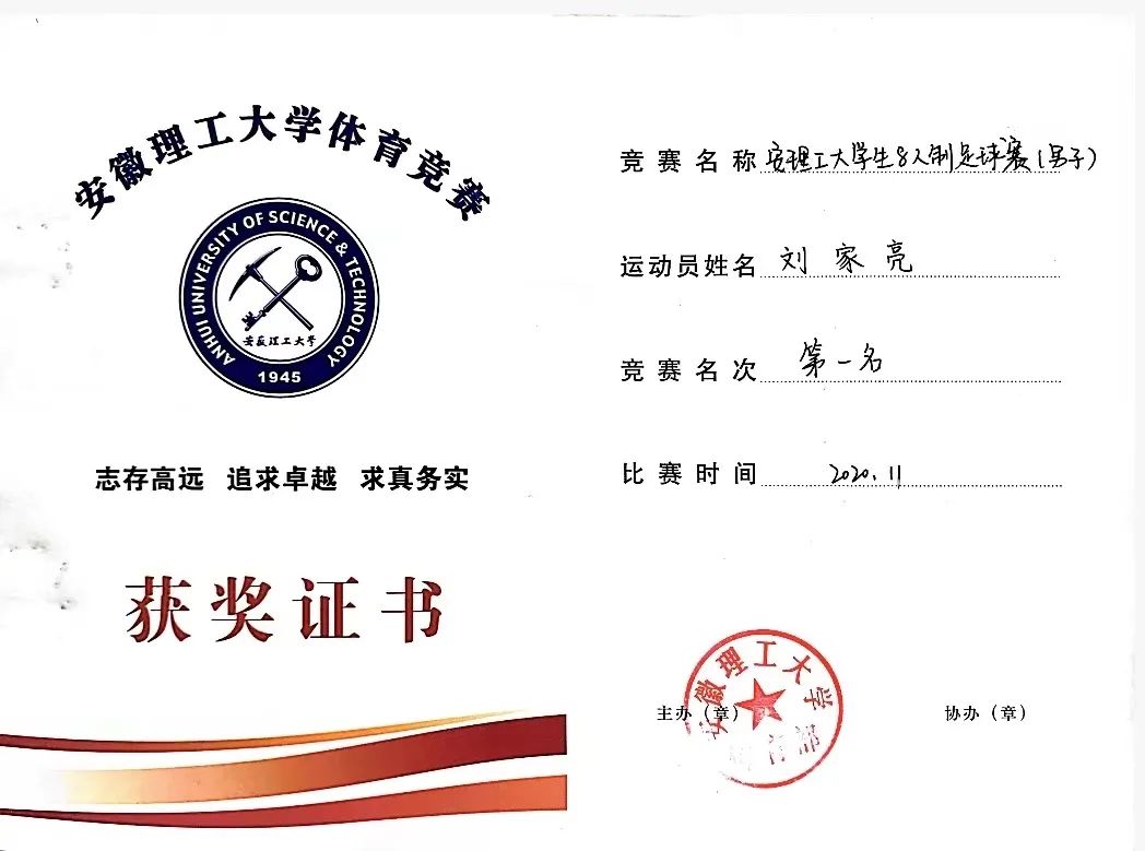 刘家亮是个运动达人,作为经济与管理学院足球队的主力,刘家亮的足球技巧可谓是炉火纯青。球场上,颠球、快传、走位,各种花式操作让人应接不暇。“平时周末的时候,大家会一起约出来训练打比赛。”2021年安徽理工大学足球联赛的赛场上,在前锋、后卫、守门员的紧密配合,学院的呐喊助威下,经管学院获得了校足球联赛的冠军。“我坚信我能赢,因为我的背后是永远支持我的同伴。”这种信念一直支持着刘家亮无论是比赛还是生活中。