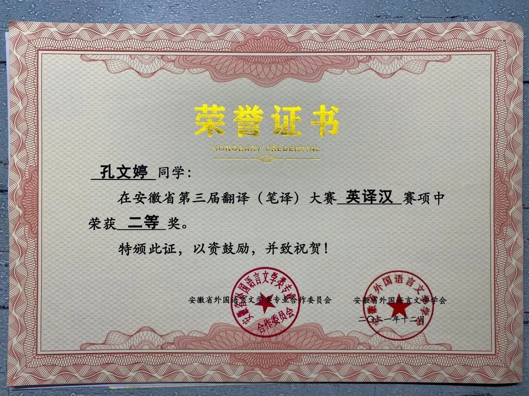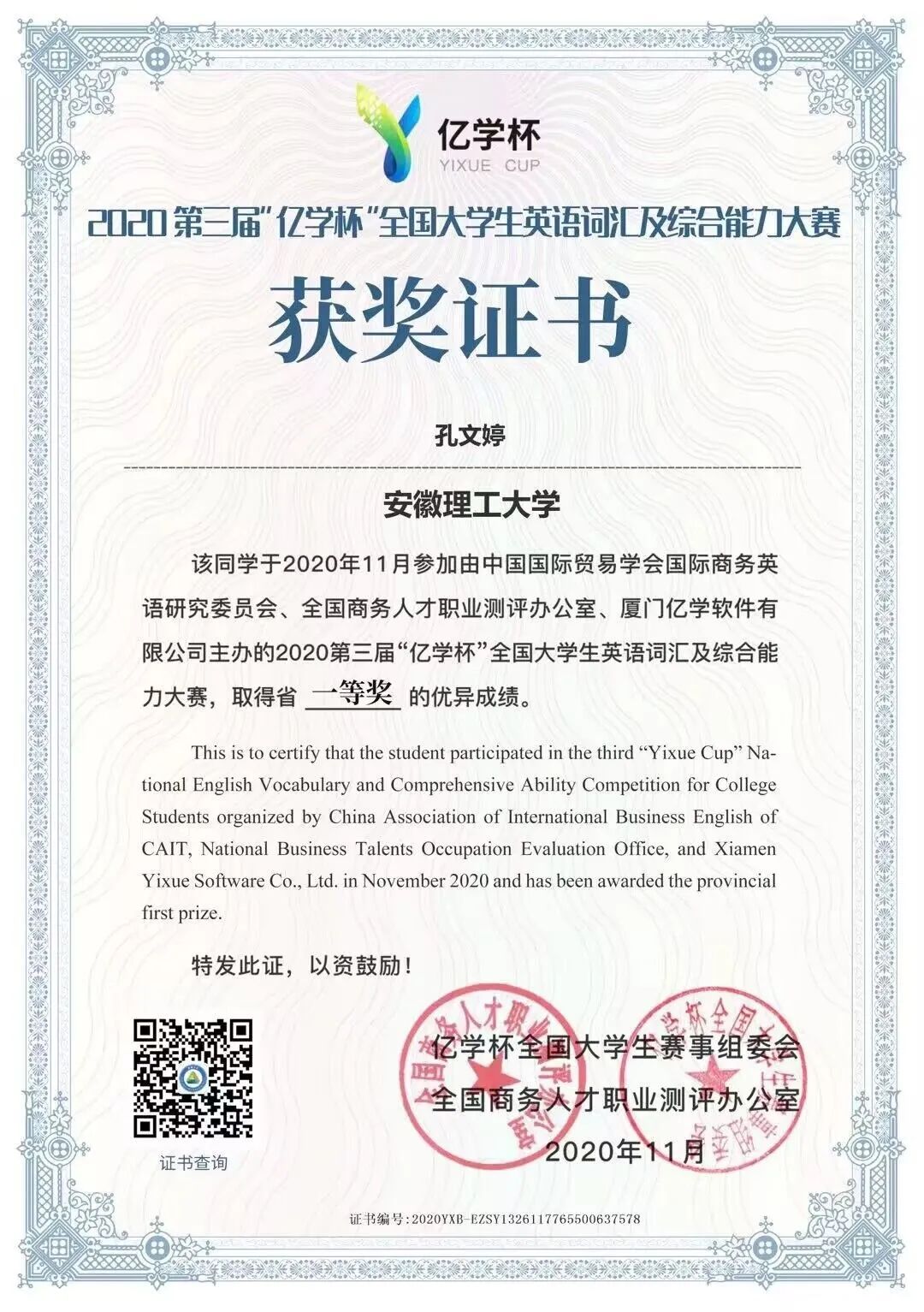 孔文婷,外国语学院英语专业英语2019级3班学生,中共预备党员。担任班级学习委员,连续三年获得一等奖学金,被授予三好学生,三好学生标兵,优秀学生干部,优秀学生干部标兵等荣誉称号。获得第三届“亿学杯”全国大学生英语词汇及综合能力大赛省一等奖,安徽省第三届翻译大赛英译汉二等奖等奖项。现已被推免至中国石油大学(华东)。