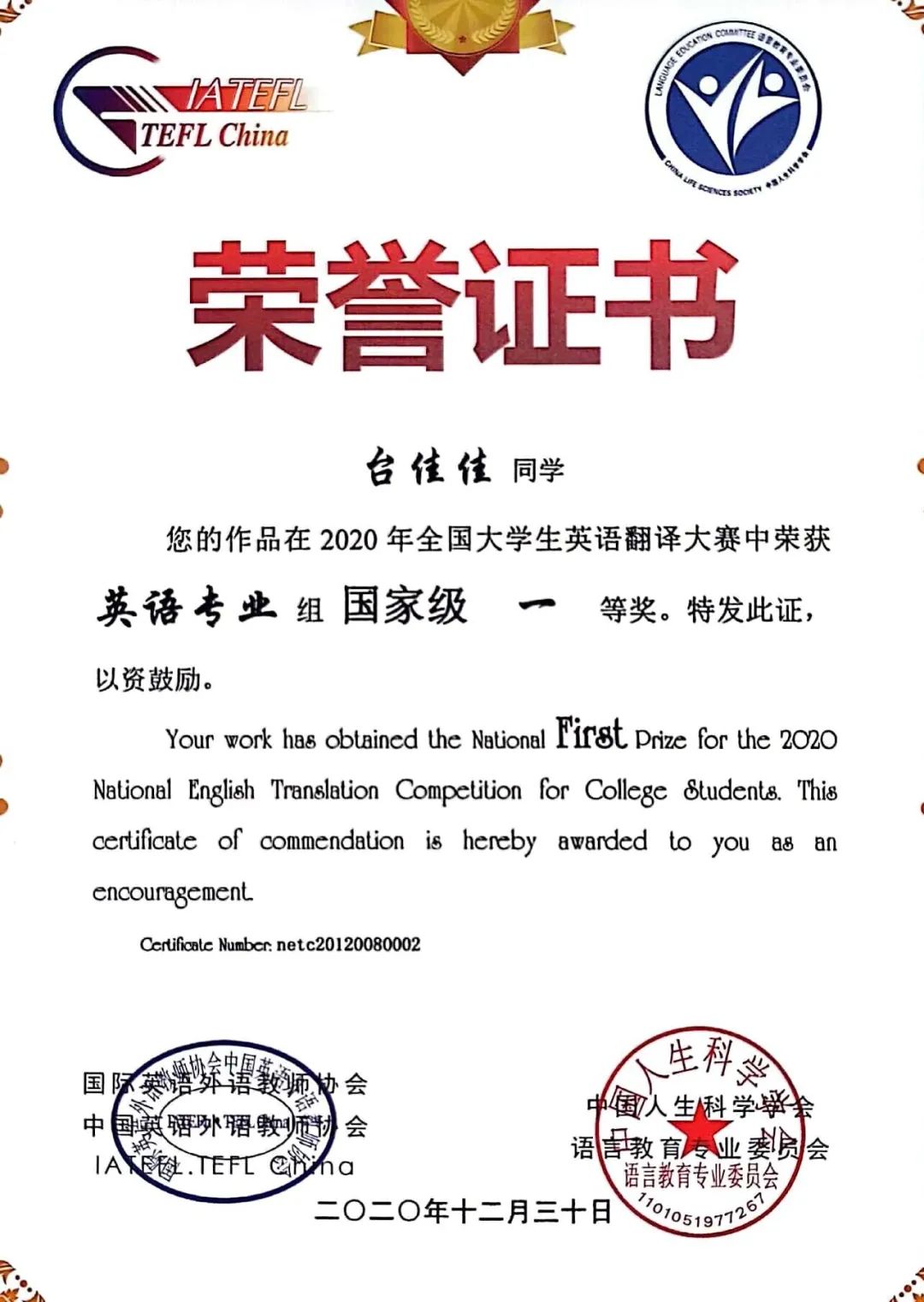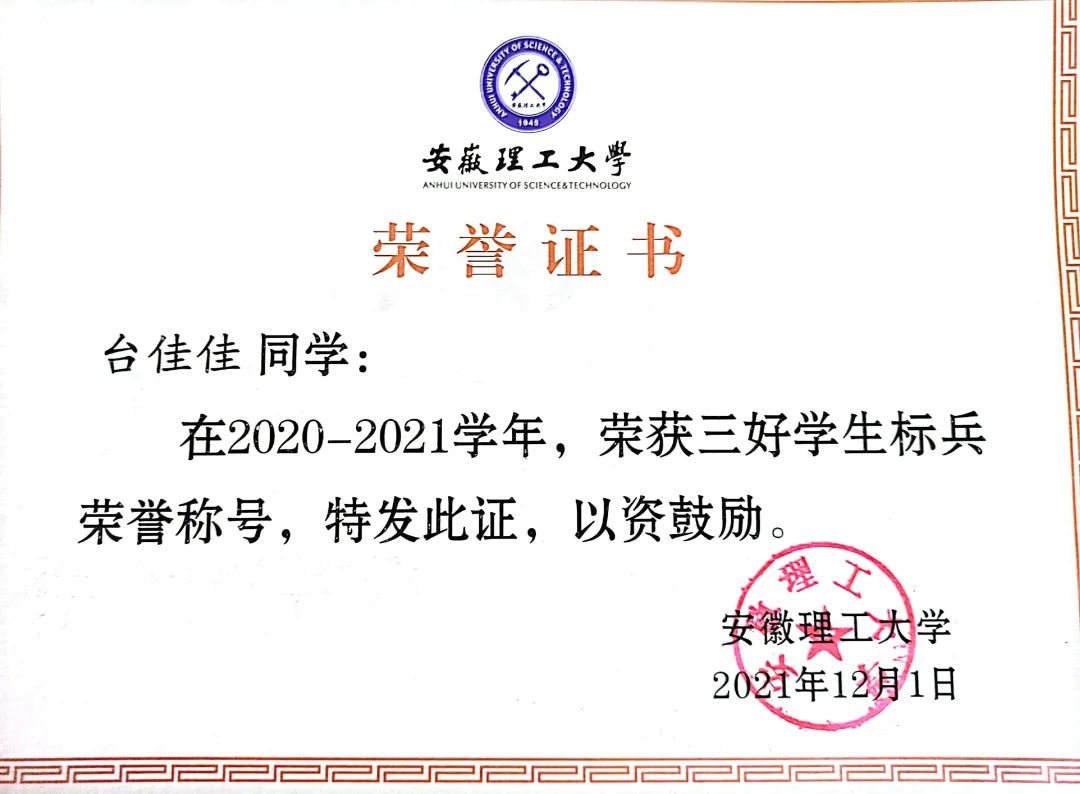 台佳佳,外国语学院英语专业2019级2班学生,中共预备党员。大学期间获得国家奖学金,三好学生标兵等荣誉称号,获得全国大学生英语竞赛B类特等奖,全国英语大学生翻译大赛一等奖,外研社杯跨文化交际大赛安徽赛区三等奖等奖项。现已被推免至安徽大学。