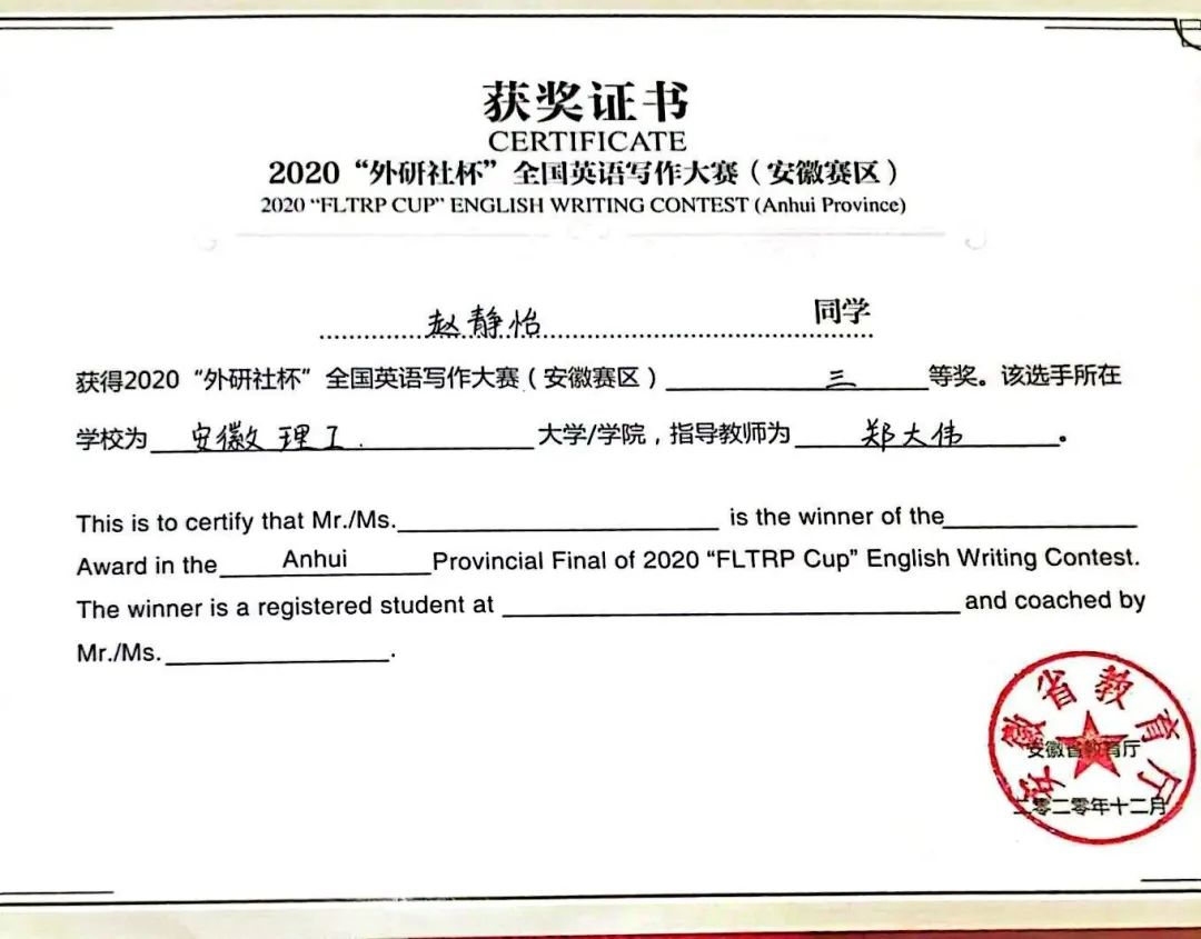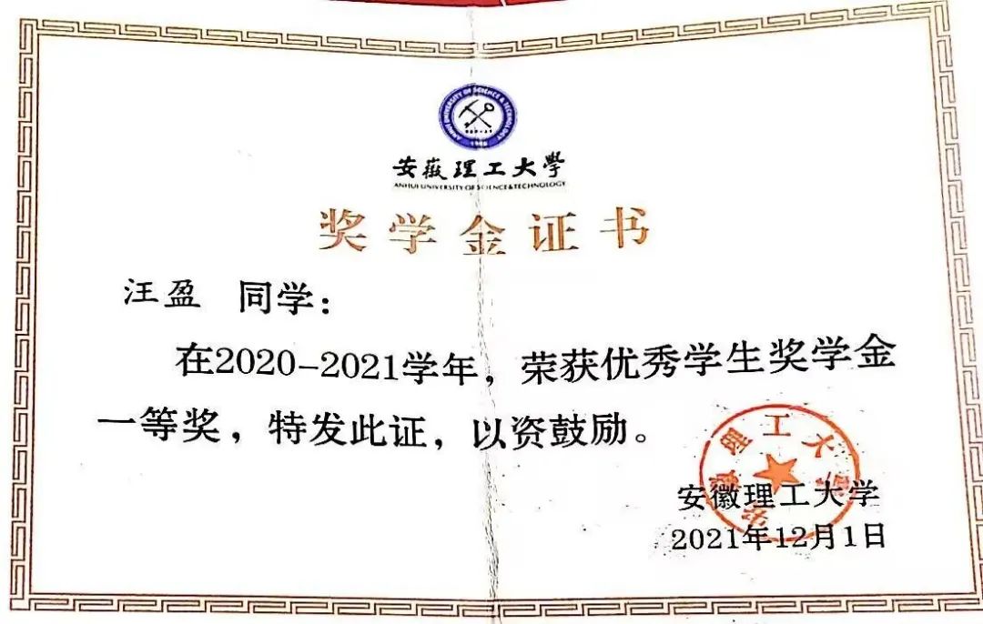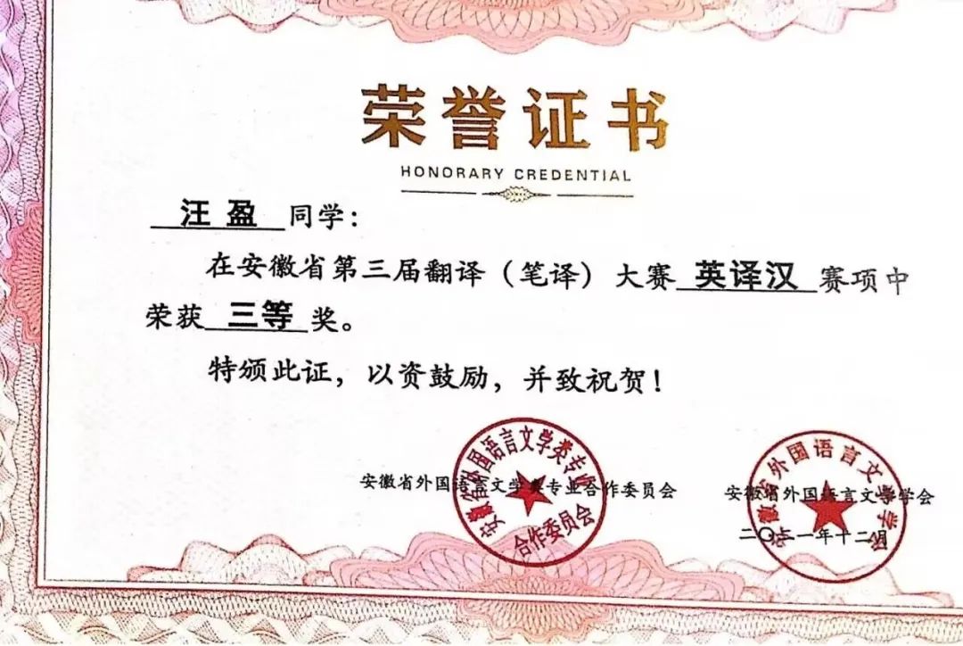汪盈,外国语学院英语专业汪盈英语2019级5班学生,共青团员。在校期间荣获三年一等奖学金、优秀共青团员与三好学生等荣誉。获得第六届“亿学杯”全国商务英语实践技能大赛省级二等奖、安徽省第三届英语翻译(笔译)大赛英译汉组省级三等奖、全国大学生英语竞赛二等奖、全国大学生英语作文大赛省级三等奖、外研社写作大赛校一等奖、外研社阅读大赛校一等奖、2020第三届“亿学杯”英语词汇及综合能力大赛省级一等奖……现已被推免至中国地质大学(武汉)。