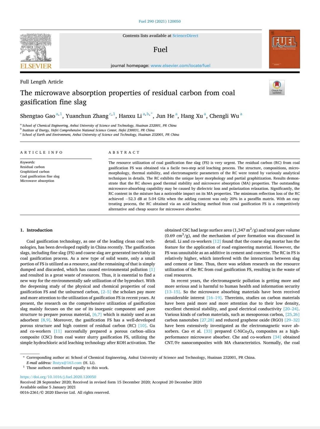 张元春博士期间,在其导师李寒旭教授的鼓励下,二人开始学科交叉,共同迈进新的科研领域,迎接新挑战。从最基础的碳管、石墨烯等吸波材料开始研究,慢慢上手,积累科研基础,逐渐过渡到煤气化细渣的处理,二人和研究生一起通过不断地试验,研究了其对电磁波的衰减损耗,课题研究期间在实验室里奋战到凌晨一、两点是常态,“努力的背影,无声的陪伴”是彼此前进的动力与支持。经过反复的实验、推敲,团队电磁波吸收材料研究成果被遴选为关键科学文章,在煤基固废高值化利用方面的研究成果被国际TOP期刊《Fuel》《Journal of Materials Science & Technology》等连续报道,由高圣涛主持的项目——《煤气化细灰基铁氧体吸波材料性能调控机制研究》获批2022年国家自然科学基金项目。二人坦言,未来也将进行深度研究,努力将科研成果投入为实际运用,真正实现“以废治污”。高圣涛、张元春夫妇的互相陪伴、彼此互补及对科研的积极投身、坚持不懈,使他们面对挑战不畏惧,科研路上挑大梁,积极践行安理青年科研人的责任使命!