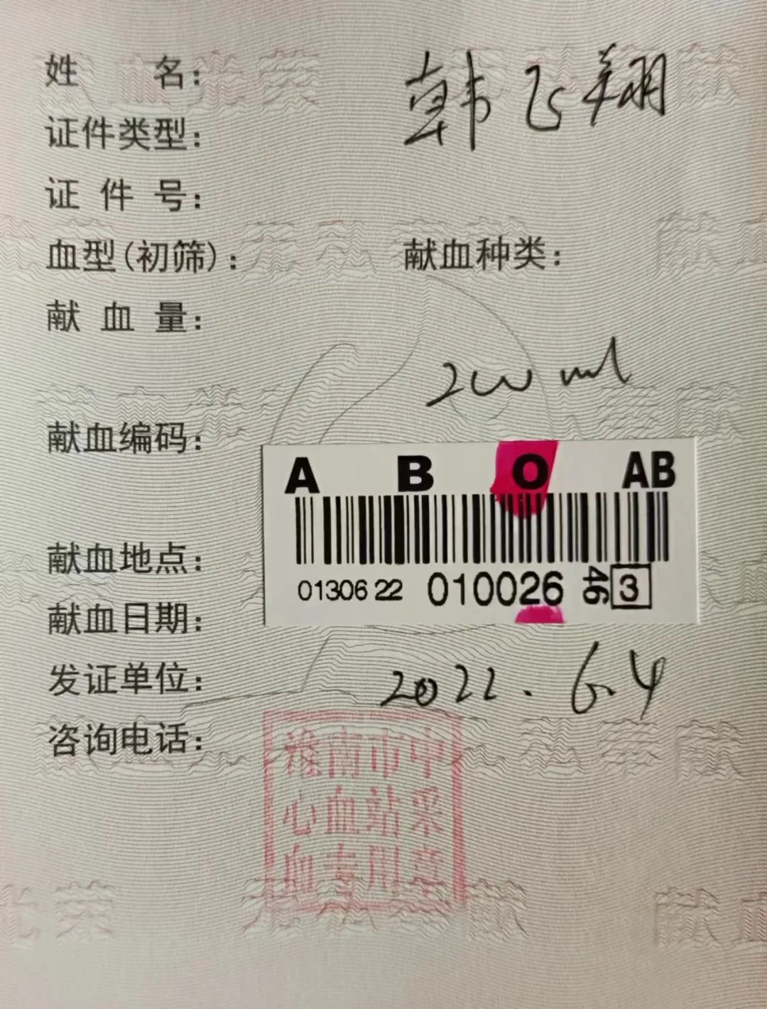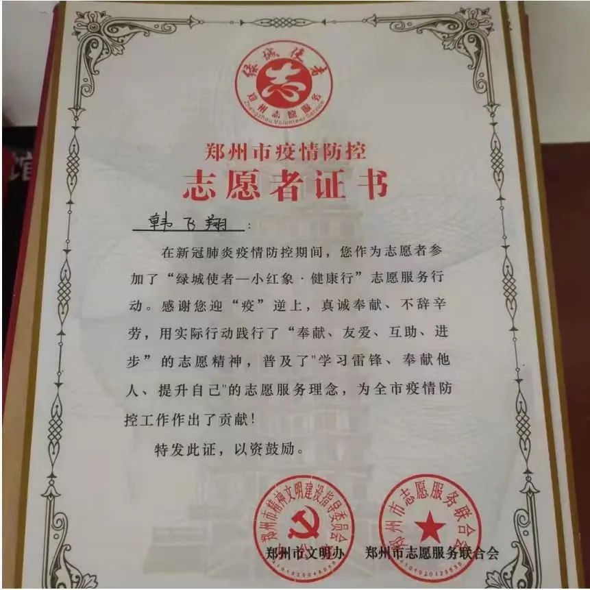此外,他还参加了很多的志愿活动。其中包括郑州市疫情防控服务工作、志愿植树活动和爱心献血活动。在郑州市疫情防控服务工作中,他主要负责检查小区人员健康码的状态,测量体温,并且帮助小区里不会使用手机的老人扫码或者登记姓名。他希望自己能够在闲暇的时间为城市做出一点贡献,发一点光和热。志愿服务的过程必然不是轻松的,他在小区门口搭的帐篷里值班,从凌晨12点到早晨6点,累了就趴在桌子上休息一会儿。韩飞翔在值班期间也收获了很多的温暖,小区的业主们会贴心地将买来的水和泡面之类的补给放在门岗上,什么也不说,放好了就直接离开。“虽然听起来有点夸张,但是这次志愿活动真的让我感受到了什么是人间有爱,什么又是真正的人人为我,我为人人。”当问及这次志愿活动的收获时,韩飞翔这样说到。这次活动带给了韩飞翔深刻的感触,也让他更加坚定要好好学习,在自己的领域里为社会做贡献。