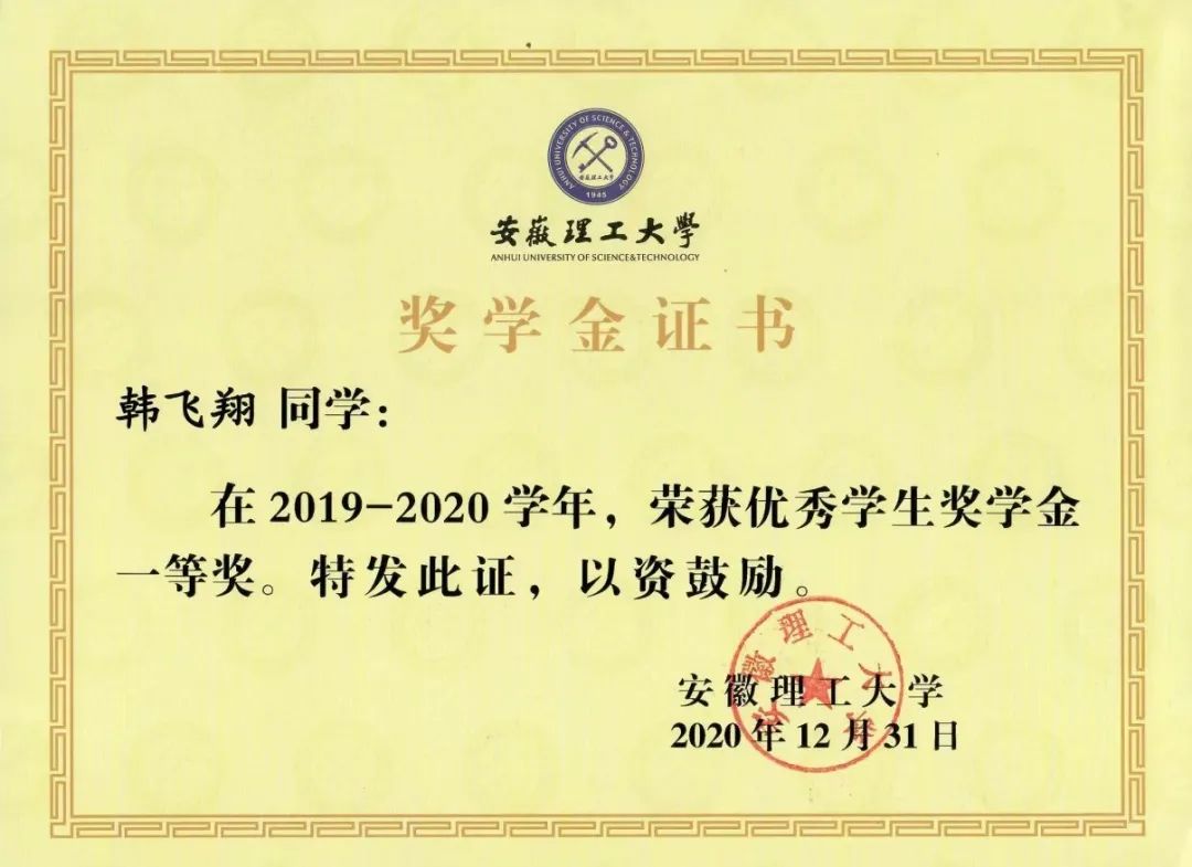 在校期间,曾荣获国家励志奖学金、优秀学生奖学金一等奖、优秀共青团员、三好学生标兵等。韩飞翔还曾多次参加志愿服务活动,于2021年参加了郑州疫情防控志愿服务行动。