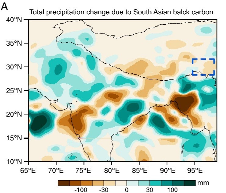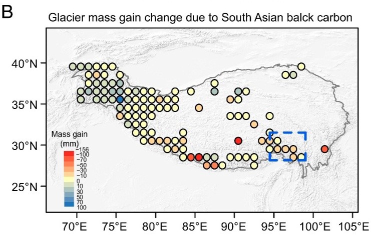 近日,我校空间信息与测绘工程学院教师张震教授联合中国科学院西北生态环境资源研究院康世昌研究员课题组、美国犹他州立大学犹他州气候中心Robert教授,发现南亚黑碳跨境污染是导致青藏高原东南部冰川退缩的因素之一,在国际知名综合性期刊PNAS发表了题为《Monsoon precipitation decrease due to black carbon reduces mass gain for glaciers over the southeastern Tibetan Plateau》的研究论文。中国科学院西北生态环境资源研究院杨俊华副研究员为论文第一作者。