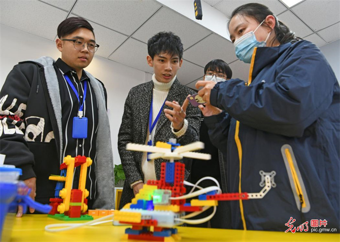 2021年11月23日,安徽理工大学第三届皖台高校科技文化交流论坛开幕,两岸青年师生通过科创主题线上线下交流,科创基地体验互动,参观走访淮南市高新技术企业等多种形式,共话青年创新创业。图为中国台湾师生与安徽理工大学大学生探讨乐高编程。(陈彬摄/光明图片)