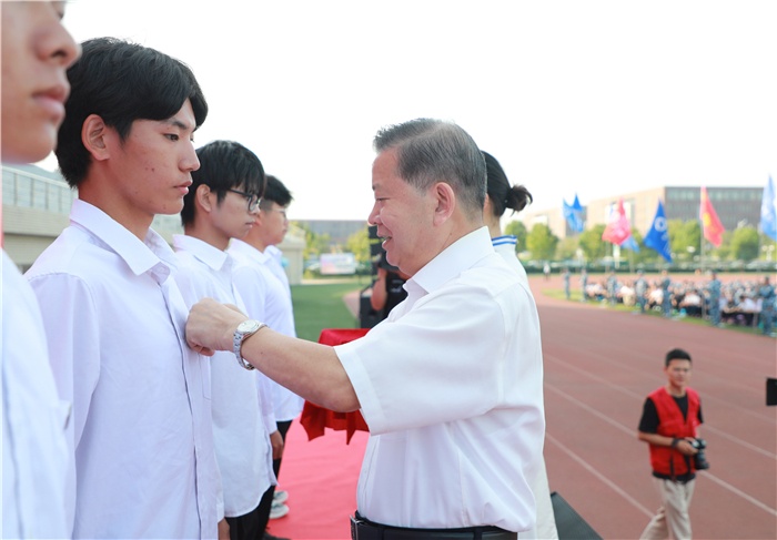典礼上,郭永存、袁亮为新生代表佩戴了校徽。全场新生一同佩戴上了校徽。一枚小小的校徽,寄托着学校对新生的祝愿和期许,也承载着全体新生身为“安理人”的使命和荣光。
