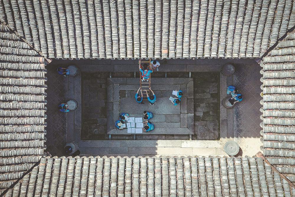 ◀ 7月15日,“倾筑”服务团的同学们对古建筑进行图像数据采集。