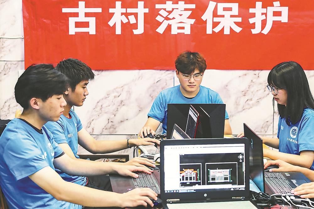 7月14日,“倾筑”服务团的同学们在加班对白天采集的古建筑数据进行建模。