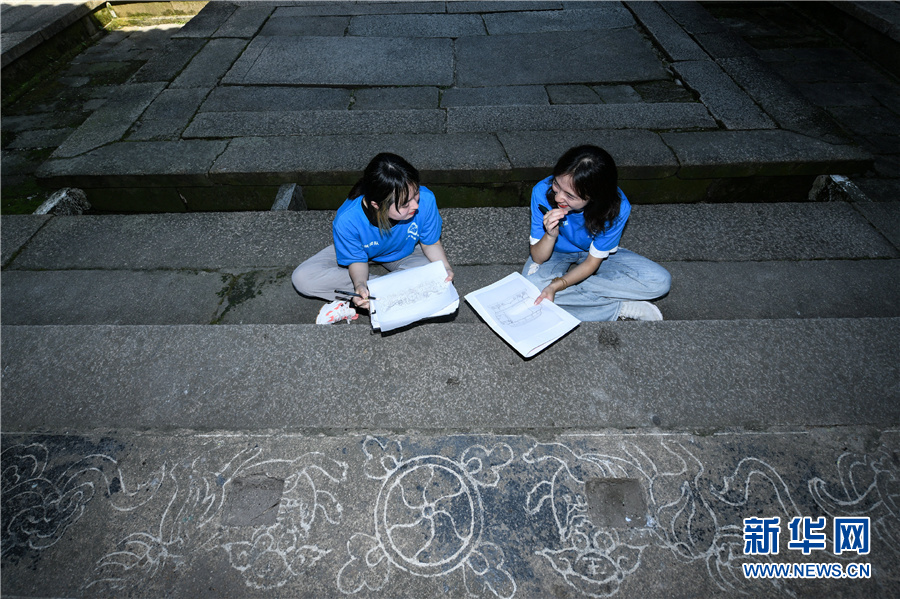 7月15日,服务团的学生对查济的宝公祠地面纹理进行绘制收集。