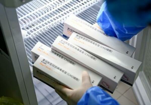 安徽理工大学第一附属医院医务人员将一批重组新型冠状病毒疫苗放入冷藏柜